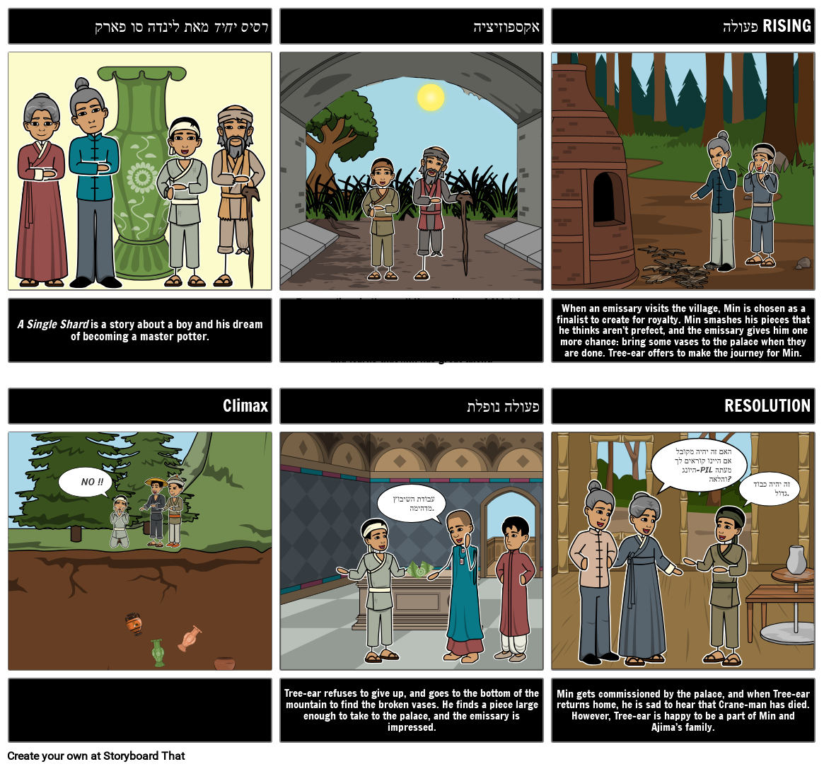Along his journey to Songdo, Tree-ear is robbed. The robbers take Min’s beautiful vases and throw them off of a high cliff, shattering them to pieces.