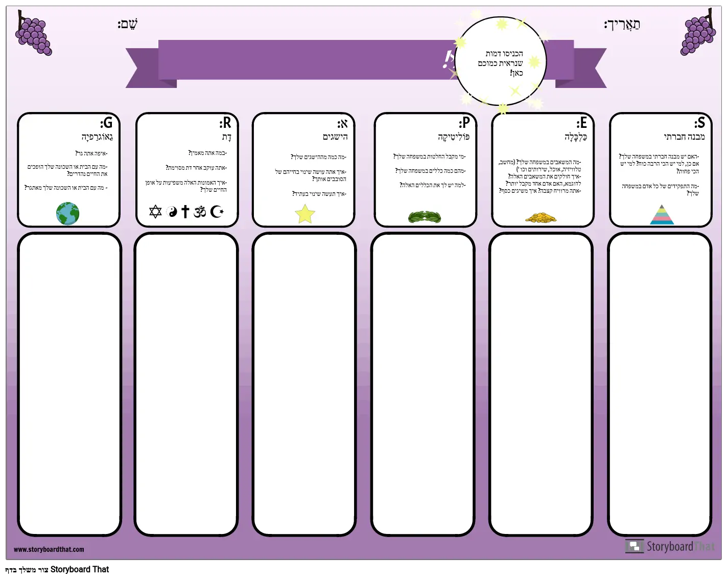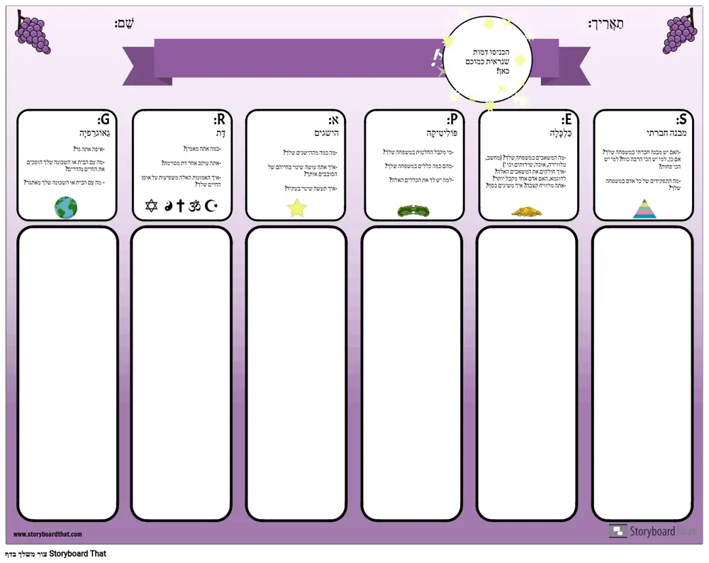 השתמש בארגון הגרפי הזה כדי להציג את ראשי התיבות GRAPES לתלמידים שלך. התלמידים עונים על השאלות בכל קטגוריה: גיאוגרפיה, דת, הישגים, פוליטיקה, כלכלה ומבנה חברתי, על ידי הרהורים על חייהם וחוויותיהם. לאחר שהייתה להם הזדמנות להרהר ולכתוב, יכולים המורים להוביל דיון בכיתה על כל קטגוריה. זוהי פעילות מועילה לבניית קהילה וכן דרך להציג את המארגן הגרפי הפשוט הזה שיכול לשמש לחקר כל תרבות קדומה.