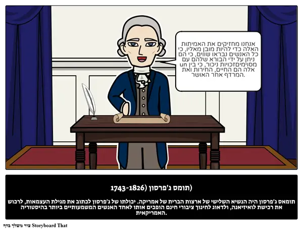 תומס ג'פרסון (1743-1826)תומאס ג'פרסון היה הנשיא השלישי של ארצות הברית של אמריקה. יכולתו של ג'פרסון לכתוב את מגילת העצמאות, לרכוש את רכישת לואיזיאנה, ולדאוג לחינוך ציבורי חינם הופכים אותו לאחד האנשים המשמעותיים ביותר בהיסטוריה האמריקאית.