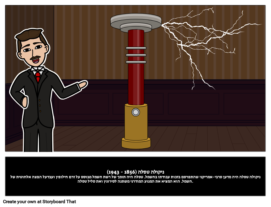 ניקולה טסלה (1856 - 1943)ניקולה טסלה היה מדען סרבי-אמריקני שהתפרסם בזכות עבודתו בחשמל. טסלה היה תומך של רשת חשמל מבוסס על זרם חילופין ועבדעל הפצה אלחוטית של חשמל. הוא המציא את המנוע המודרני משתנה לסירוגין ואת סליל טסלה.