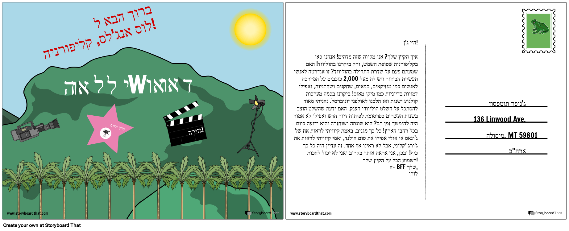 היי ג'ן! איך הקיץ שלך? אני מקווה שזה מדהים! אנחנו כאן בקליפורניה שטופת השמש, ורק ביקרנו בהוליווד! האם שמעתם פעם על שדרת התהילה בהוליווד? זו אנדרטה לאנשי תעשיית הבידור ויש לה מעל 2,000 כוכבים על המדרכה לאנשים כמו מוזיקאים, במאים, שחקנים ושחקניות, ואפילו דמויות בדיוניות כמו מיקי מאוס! ביקרנו בכמה מערכות קולנוע ישנות ואז הלכנו לאולפני יוניברסל. נהניתי מאוד להסתכל על השלט הוליוודי הענק. האם ידעת שהשלט הוצב בשנות העשרים כפרסומת לפיתוח דיור חדש ואפילו לא אמור היה להימשך זמן רב? היא שונתה ושוחזרה והיא ידועה כיום בכל רחבי הארץ! כל כך מגניב. באמת קיוויתי לראות אח של ג'ונאס או אולי אפילו את טום הולנד, ואמי קיוויתי לראות את ג'ורג 'קלוני, אבל לא ראינו אף אחד. זה עדיין היה כל כך כיף! ובכן, אני אראה אותך בקרוב ואני לא יכול לחכות לשמוע הכל על הקיץ שלך! ה- BFF שלך, לורן
