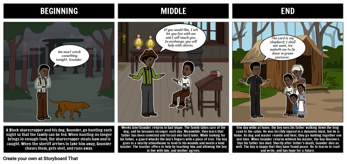 A Black sharecropper and his dog, Sounder, go hunting each night so that the family can be fed. When hunting no longer brings in enough food, the sharecropper steals ham and is caught. When the sheriff arrives to take him away, Sounder chases them, gets shot, and runs away.