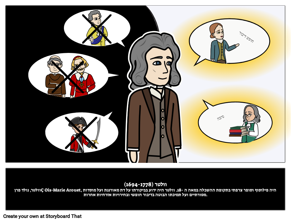וולטר (1694-1778)וולטר, נולד פרןÇ Ois-Marie Arouet, היה פילוסוף וסופר צרפתי בתקופת ההשכלה במאה ה -18. וולטר היה ידוע בביקורתו על דת מאורגנת ועל מוסדות מסורתיים ועל תמיכתו הבוטה בדיבור חופשי ובחירויות אזרחיות אחרות.