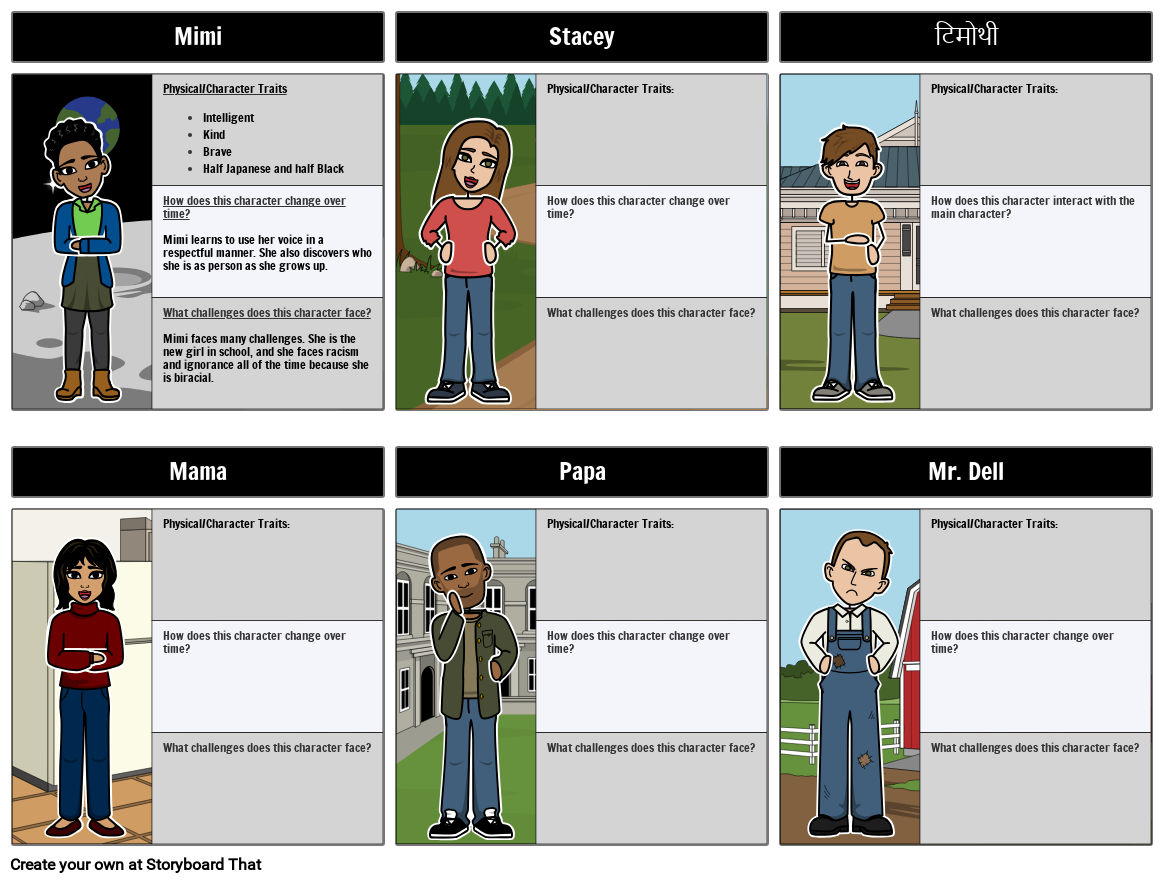 Physical/Character TraitsIntelligentKindBraveHalf Japanese and half Black How does this character change over time?Mimi learns to use her voice in a respectful manner. She also discovers who she is as person as she grows up. What challenges does this character face?Mimi faces many challenges. She is the new girl in school, and she faces racism and ignorance all of the time because she is biracial.