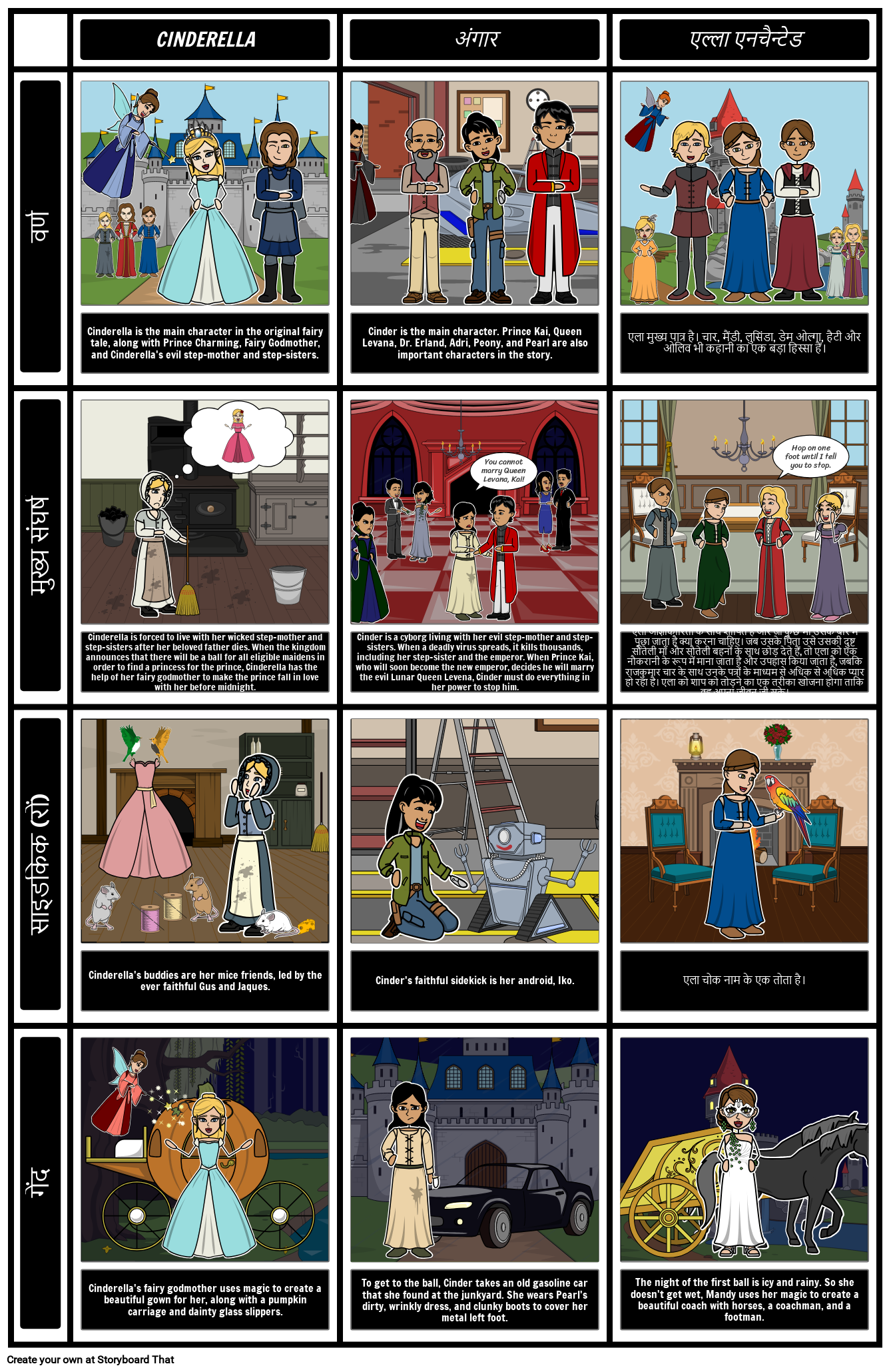 चार्ट जो सिंडर, एला एनचांटेड और सिंड्रेला की तुलना करता है
