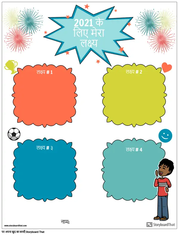 छात्र बॉक्स में 2021 के लिए अपने शीर्ष 4 लक्ष्यों को टाइप करेंगे। फिर, वे वर्ण, आइटम और प्रतीक चुन सकते हैं जो स्वयं और उनके लक्ष्यों का प्रतिनिधित्व करते हैं और टेम्पलेट में मौजूदा लोगों को प्रतिस्थापित करते हैं।