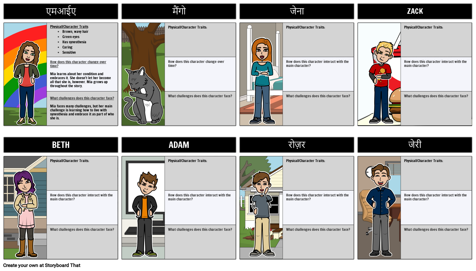 Physical/Character TraitsBrown, wavy hairGreen eyesHas synesthesia CaringSensitive How does this character change over time?Mia learns about her condition and embraces it. She doesn't let her become all that she is, however. Mia grows up throughout the story. What challenges does this character face?Mia faces many challenges, but her main challenge is learning how to live with synesthesia and embrace it as part of who she is.