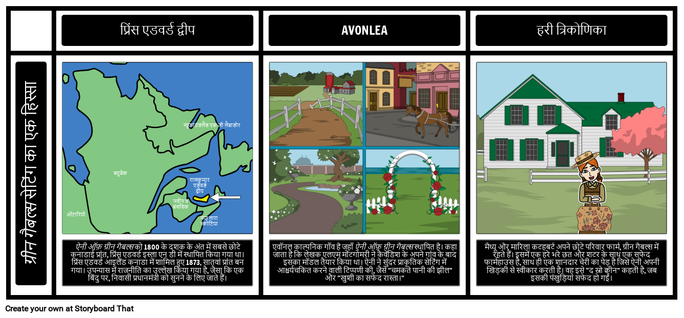 साहित्य में सेटिंग कहानी का स्थान और समय, या जहां और जहां है, और अक्सर एक महत्वपूर्ण भूमिका निभाता है जैसा कि एनी ऑफ ग्रीन गैबल्स में होता है। कनाडा में प्रिंस एडवर्ड आइलैंड के एवोनियल में ग्रीन गैबल्स की स्थापना लगभग एक और चरित्र की तरह है। इस गतिविधि में छात्र उन विभिन्न स्थानों का पता लगा सकते हैं, जो ऐनी अपने समय के दौरान एवोनले में बड़े हुए थे।