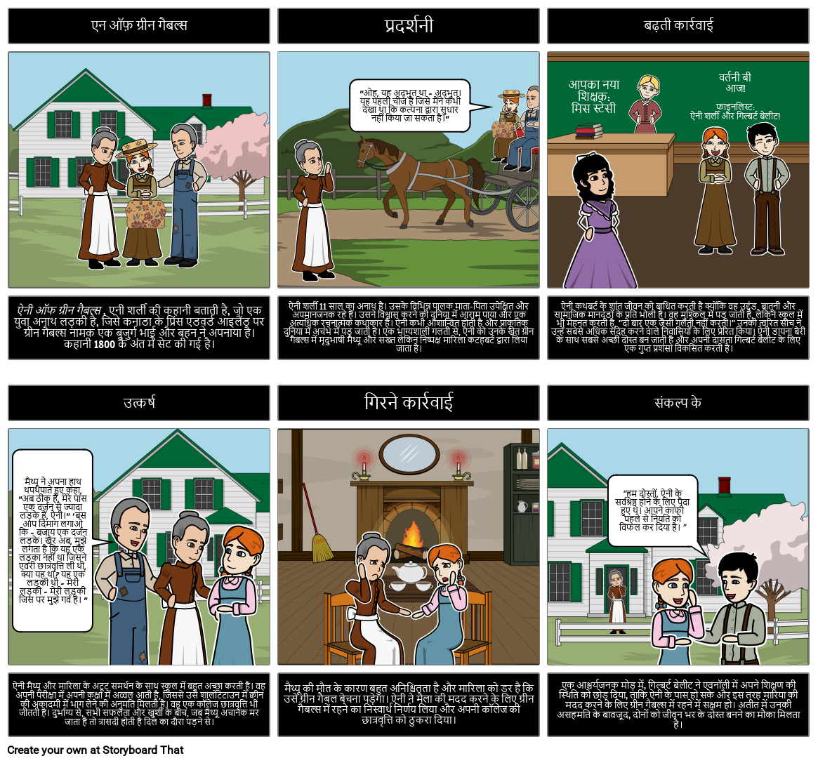 LM मोंटगोमरी द्वारा ऐनी ऑफ़ ग्रीन गैबल्स के लिए एक प्लॉट आरेख बनाएँ। एक्सपोज़र, राइजिंग एक्शन, क्लाइमैक्स, फ़ॉलिंग एक्शन और रिज़ॉल्यूशन शामिल करें। संशोधित करने के लिए, छात्र एक आरेख बना सकते हैं जिसमें परिचय, शुरुआत, मध्य और अंत शामिल हैं।