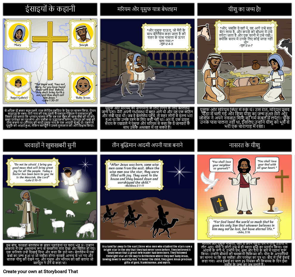 छात्र ईसाई धर्म से संबंधित कहानी के कुछ हिस्सों को चित्रित कर सकते हैं, जैसे कि यीशु का जन्म, एक जीवनी, या अन्य साहित्य।