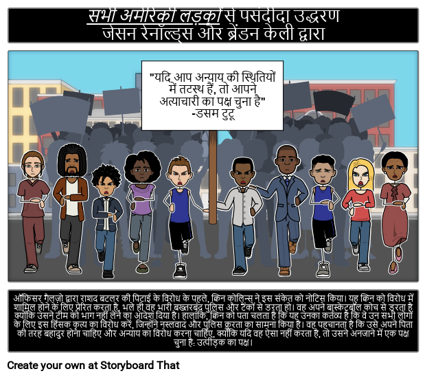 ऑफिसर गैलज़ो द्वारा राशद बटलर की पिटाई के विरोध के पहले, क्विन कोलिन्स ने इस संकेत को नोटिस किया। यह क्विन को विरोध में शामिल होने के लिए प्रेरित करता है, भले ही वह भारी बख्तरबंद पुलिस और टैंकों से डरता हो। वह अपने बास्केटबॉल कोच से डरता है क्योंकि उसने टीम को भाग नहीं लेने का आदेश दिया है। हालांकि, क्विन को पता चलता है कि यह उनका कर्तव्य है कि वे उन सभी लोगों के लिए इस हिंसक कृत्य का विरोध करें, जिन्होंने नस्लवाद और पुलिस क्रूरता का सामना किया है। वह पहचानता है कि उसे अपने पिता की तरह बहादुर होना चाहिए और अन्याय का विरोध करना चाहिए, क्योंकि यदि वह ऐसा नहीं करता है, तो उसने अनजाने में एक पक्ष चुना है: उत्पीड़क का पक्ष।
