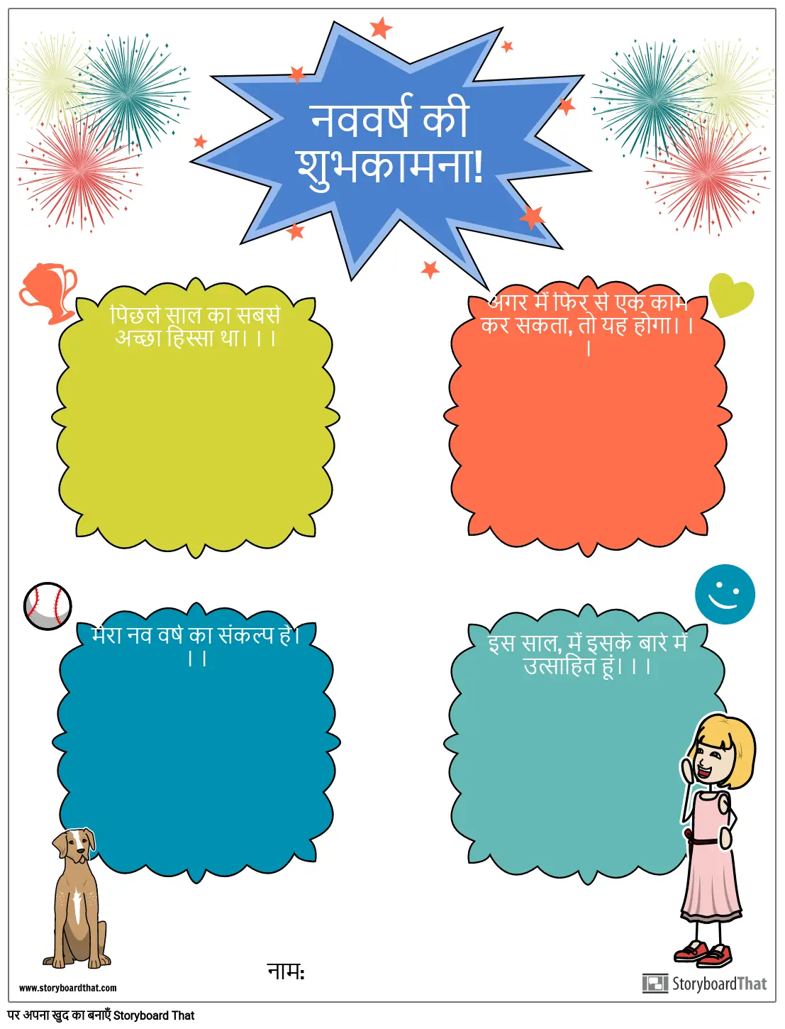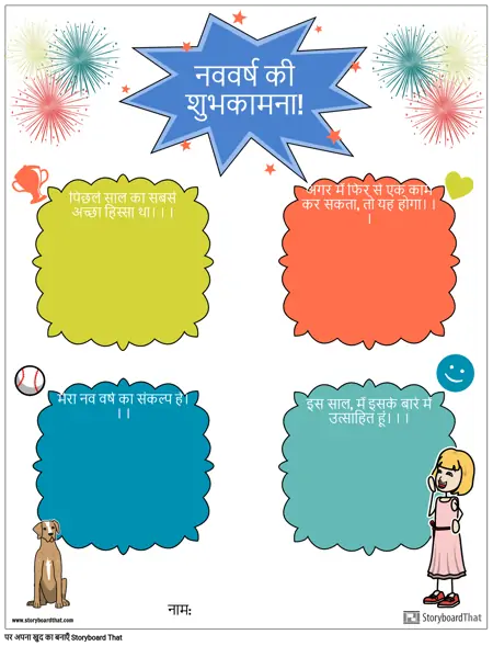 छात्र पिछले वर्ष को प्रतिबिंबित करने और आने वाले वर्ष के लिए लक्ष्य बनाने के लिए प्रत्येक बॉक्स में वाक्य शुरुआत को पूरा करेंगे। फिर, वे चरित्र और प्रतीकों को एक चरित्र, वस्तुओं और प्रतीकों के साथ बदल देंगे जो उन्हें प्रतिबिंबित करते हैं।
