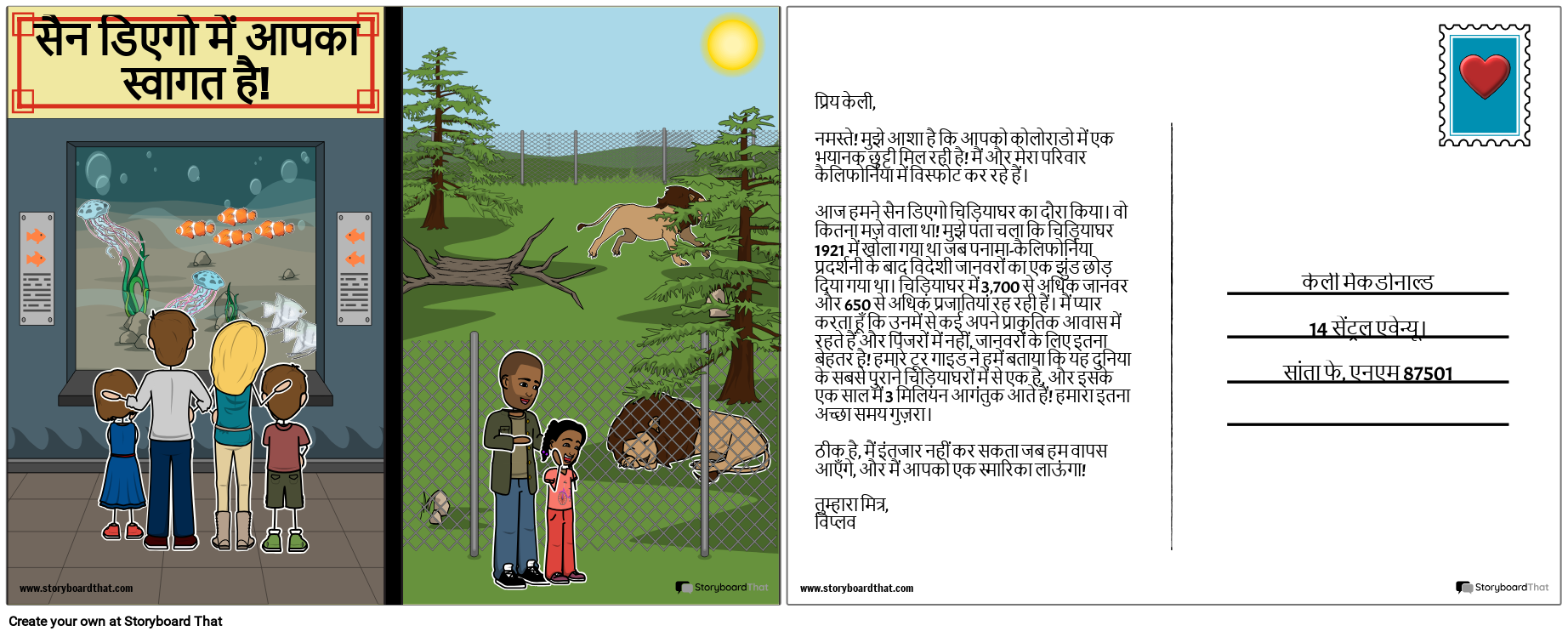 प्रिय केली, नमस्ते! मुझे आशा है कि आपको कोलोराडो में एक भयानक छुट्टी मिल रही है! मैं और मेरा परिवार कैलिफोर्निया में विस्फोट कर रहे हैं। आज हमने सैन डिएगो चिड़ियाघर का दौरा किया। वो कितना मज़े वाला था! मुझे पता चला कि चिड़ियाघर 1921 में खोला गया था जब पनामा-कैलिफोर्निया प्रदर्शनी के बाद विदेशी जानवरों का एक झुंड छोड़ दिया गया था। चिड़ियाघर में 3,700 से अधिक जानवर और 650 से अधिक प्रजातियां रह रही हैं। मैं प्यार करता हूँ कि उनमें से कई अपने प्राकृतिक आवास में रहते हैं और पिंजरों में नहीं, जानवरों के लिए इतना बेहतर है! हमारे टूर गाइड ने हमें बताया कि यह दुनिया के सबसे पुराने चिड़ियाघरों में से एक है, और इसके एक साल में 3 मिलियन आगंतुक आते हैं! हमारा इतना अच्छा समय गुज़रा। ठीक है, मैं इंतजार नहीं कर सकता जब हम वापस आएँगे, और मैं आपको एक स्मारिका लाऊंगा! तुम्हारा मित्र, विप्लव