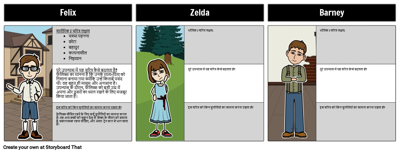शारीरिक / चरित्र लक्षण चश्मा पहनना छोटा बहादुर कल्पनाशील निष्ठावान पूरे उपन्यास में यह चरित्र कैसे बदलता है? फेलिक्स का मानना है कि उनके माता-पिता को निशाना बनाया गया क्योंकि उन्हें किताबें पसंद थीं। वह बहुत ही मासूम और अनजाना है। उपन्यास के दौरान, फेलिक्स को बड़ी उम्र में अपना और दूसरों का ध्यान रखने के लिए मजबूर किया जाता है। इस चरित्र को किन चुनौतियों का सामना करना पड़ता है? फेलिक्स जीवित रहने के लिए कई चुनौतियों का सामना करता है। वह अन्य बच्चों को सुकून देता है, ज़ेल्डा के जीवन को बचाता है, सकारात्मक रहना चाहिए, और अंततः ट्रेन कार से भाग जाता है।