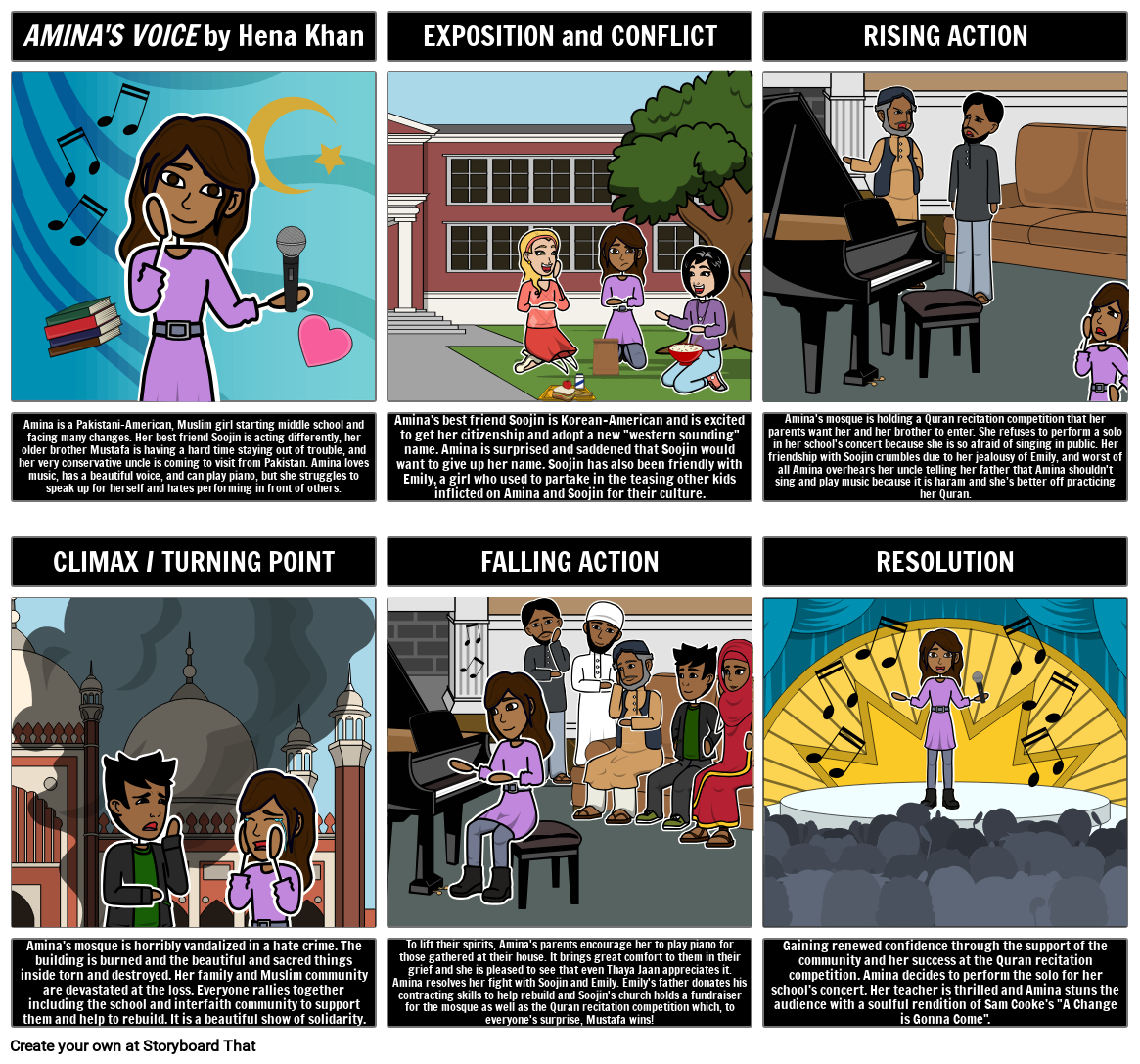 Amina is a Pakistani-American, Muslim girl starting middle school and facing many changes. Her best friend Soojin is acting differently, her older brother Mustafa is having a hard time staying out of trouble, and her very conservative uncle is coming to visit from Pakistan. Amina loves music, has a beautiful voice, and can play piano, but she struggles to speak up for herself and hates performing in front of others.