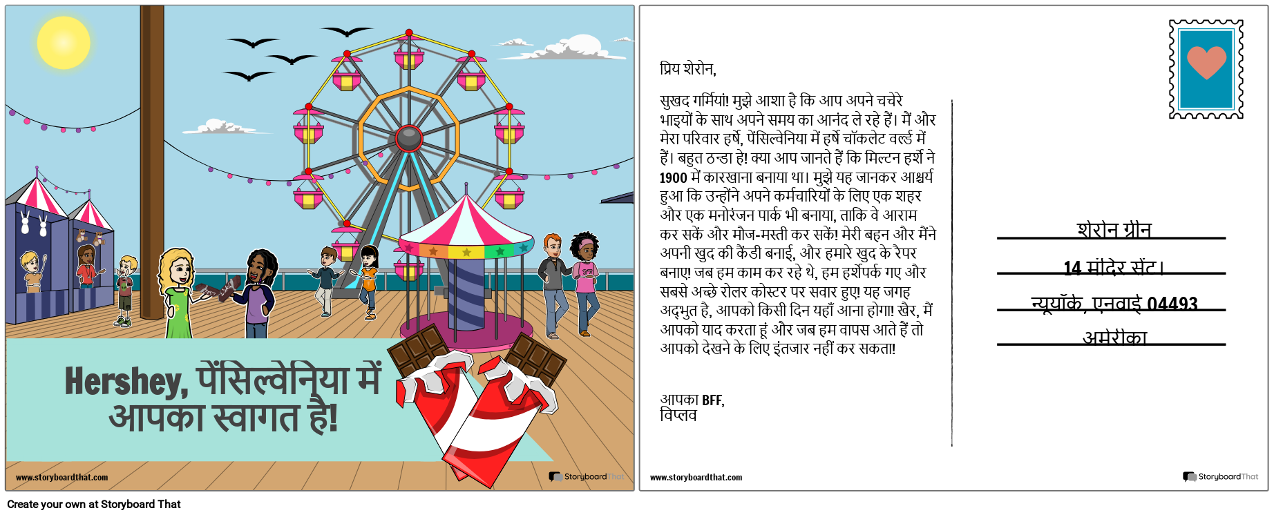 प्रिय शेरोन, सुखद गर्मियां! मुझे आशा है कि आप अपने चचेरे भाइयों के साथ अपने समय का आनंद ले रहे हैं। मैं और मेरा परिवार हर्षे, पेंसिल्वेनिया में हर्षे चॉकलेट वर्ल्ड में हैं। बहुत ठन्डा हे! क्या आप जानते हैं कि मिल्टन हर्शे ने 1900 में कारखाना बनाया था। मुझे यह जानकर आश्चर्य हुआ कि उन्होंने अपने कर्मचारियों के लिए एक शहर और एक मनोरंजन पार्क भी बनाया, ताकि वे आराम कर सकें और मौज-मस्ती कर सकें! मेरी बहन और मैंने अपनी खुद की कैंडी बनाई, और हमारे खुद के रैपर बनाए! जब हम काम कर रहे थे, हम हर्शेपर्क गए और सबसे अच्छे रोलर कोस्टर पर सवार हुए! यह जगह अद्भुत है, आपको किसी दिन यहाँ आना होगा! खैर, मैं आपको याद करता हूं और जब हम वापस आते हैं तो आपको देखने के लिए इंतजार नहीं कर सकता! आपका BFF, विप्लव