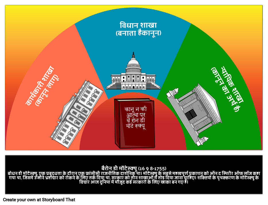 बैरन डी मोंटेक्विए (1689-1755) बैरन डी मोंटेस्क्यू, एक प्रबुद्धता के दौरान फ्रांसीसी राजनीतिक दार्शनिक थे। मोंटेस्क्यू के सबसे महत्वपूर्ण प्रकाशन को ऑन द स्पिरीर ऑफ़ लॉज कहा गया था, जिसमें उन्होंने भ्रष्टाचार को रोकने के लिए तर्क दिया था, सरकार को तीन शाखाओं में तोड़ दिया जाना चाहिए। शक्तियों के पृथक्करण के मोंटेस्क्यू के विचार आज दुनिया में मौजूद कई सरकारों के लिए खाका बन गए हैं।
