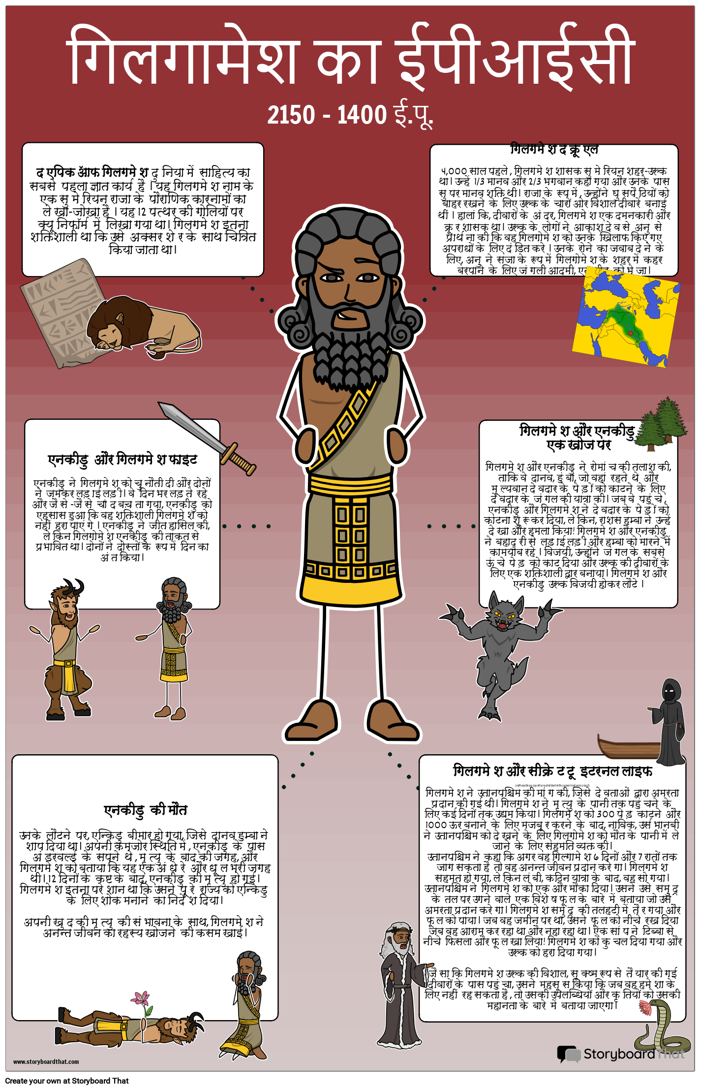 जीवनी और इतिहास के पोस्टर महत्वपूर्ण ऐतिहासिक तथ्यों या घटनाओं के बारे में महत्वपूर्ण तथ्यों और सूचनाओं को एक कलात्मक, यादगार और आकर्षक तरीके से प्रदर्शित करने का एक शानदार तरीका है। इस पोस्टर में गिलगमेश की कहानी का वर्णन किया गया है, जो माना जाता है कि यह प्राचीन सुमेर का एक वास्तविक शासक था, जिसके कारनामों का वर्णन 1800 ईसा पूर्व में लिखी गई महाकाव्य कविता में किया गया था और माना जाता है कि यह साहित्य का सबसे बड़ा महान कार्य है और दूसरा सबसे पुराना ज्ञात धार्मिक ग्रंथ है।