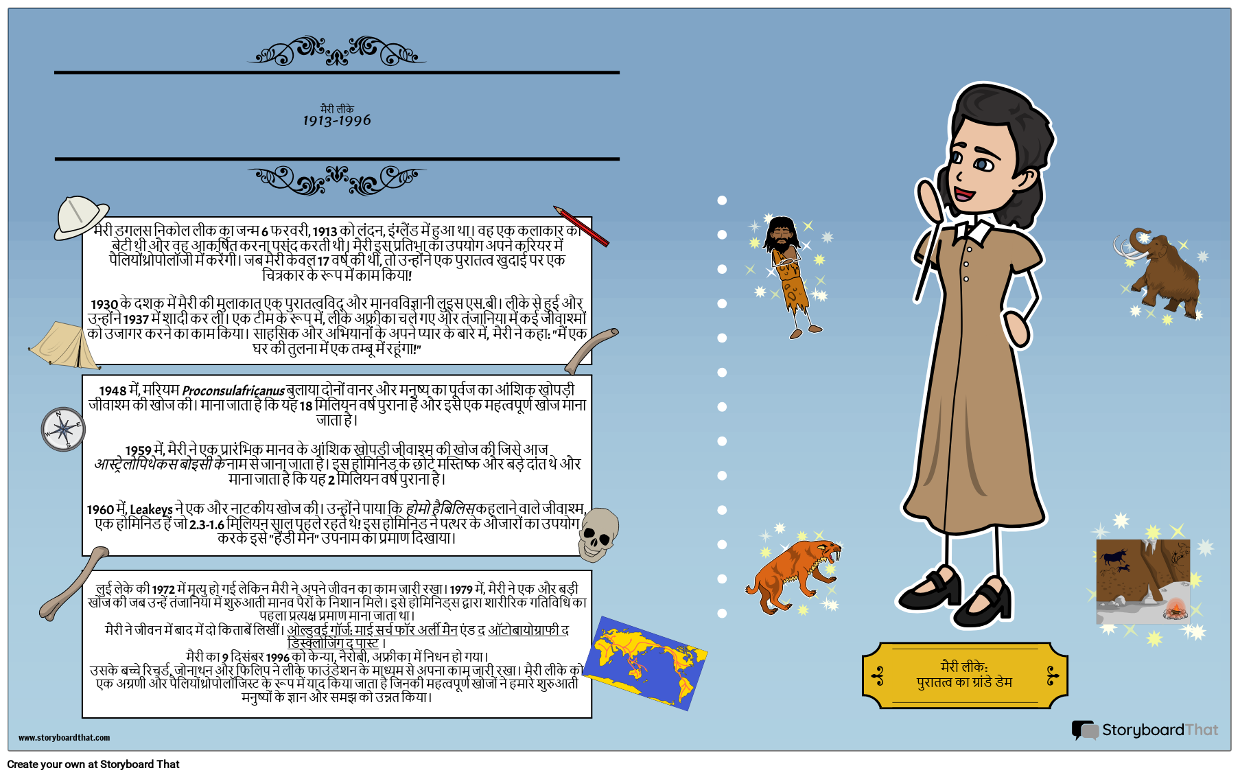 छात्र एक ऐसे व्यक्ति पर जीवनी पोस्टर पर शोध कर सकते हैं और बना सकते हैं जिसने विकास और शुरुआती मनुष्यों के बारे में हमारे ज्ञान में योगदान दिया है! यह पोस्टर प्रसिद्ध पेलियोन्थ्रोपोलॉजिस्ट मैरी लीके के बारे में है!