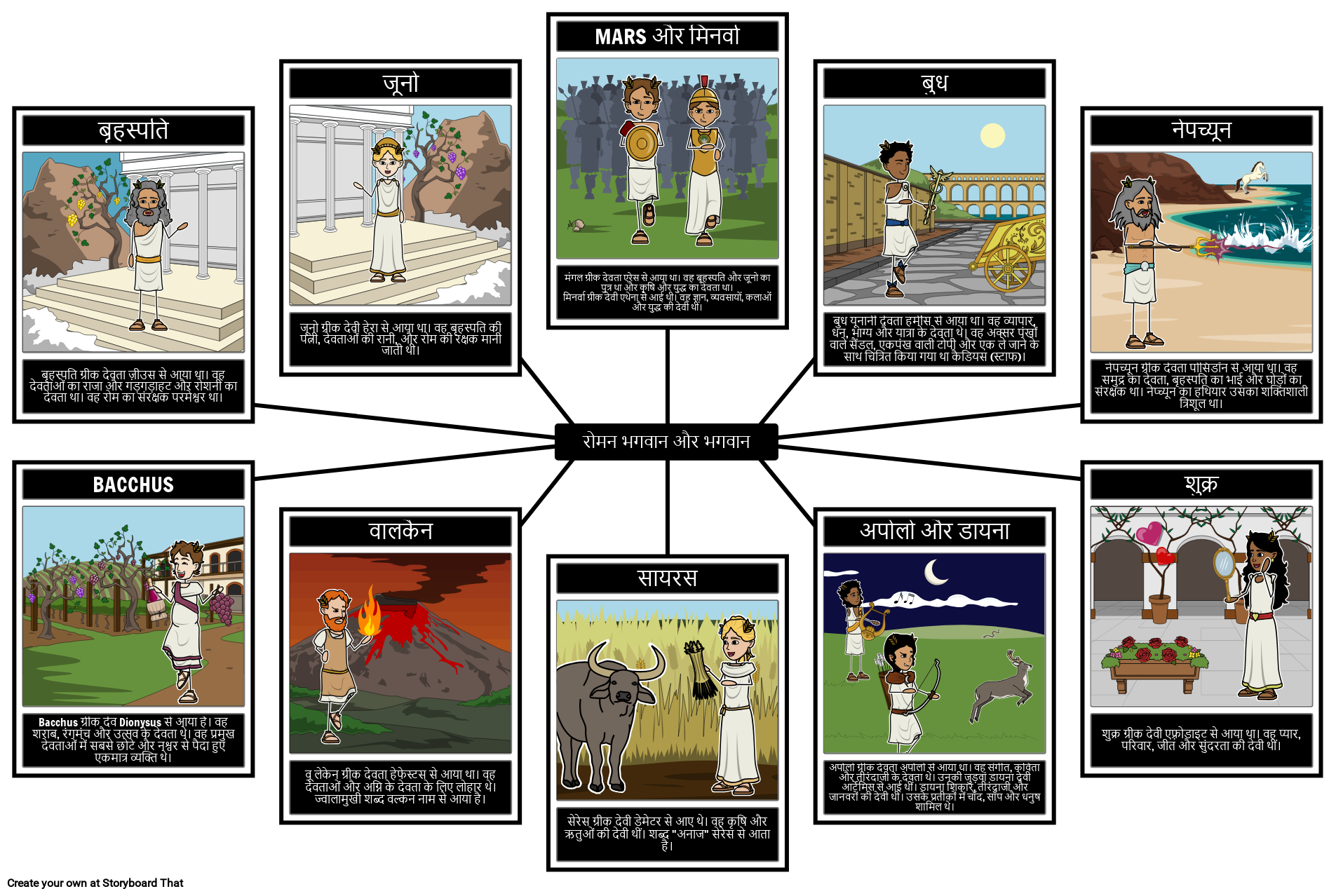 मंगल ग्रीक देवता एरेस से आया था। वह बृहस्पति और जूनो का पुत्र था और कृषि और युद्ध का देवता था। मिनर्वा ग्रीक देवी एथेना से आई थी। वह ज्ञान, व्यवसायों, कलाओं और युद्ध की देवी थीं।
