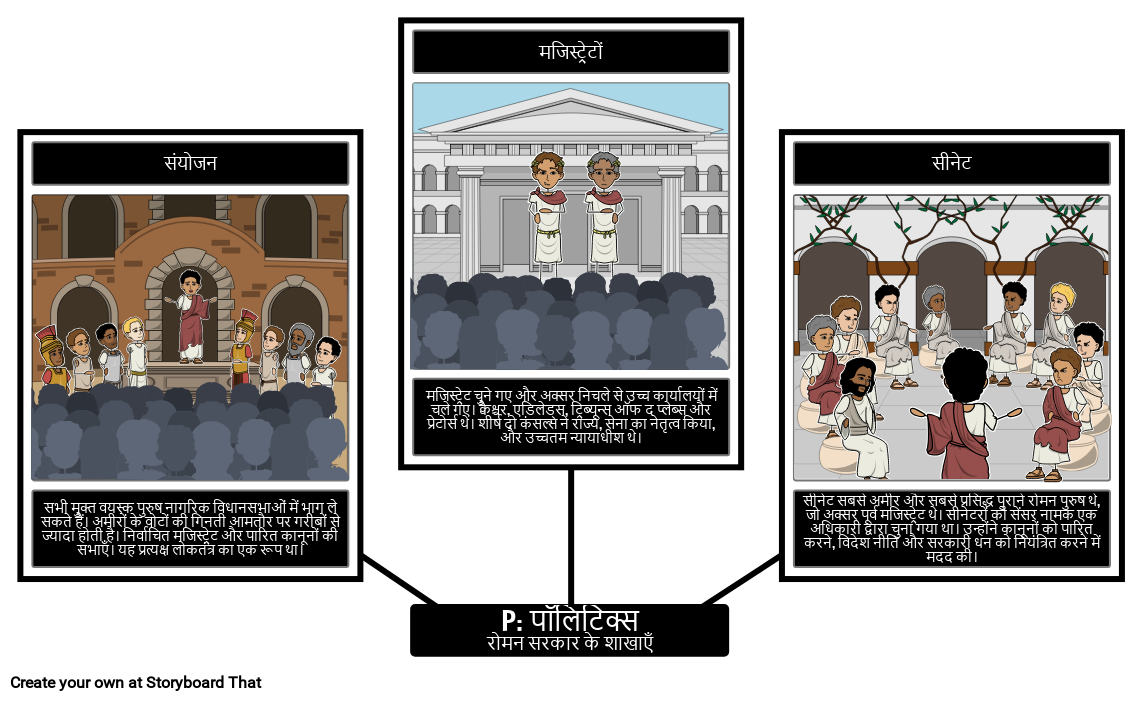 मजिस्ट्रेट चुने गए और अक्सर निचले से उच्च कार्यालयों में चले गए। क्वैश्चर, एडिलेड्स, ट्रिब्यून्स ऑफ द प्लेब्स और प्रेटोर्स थे। शीर्ष दो कंसल्स ने राज्य, सेना का नेतृत्व किया, और उच्चतम न्यायाधीश थे।