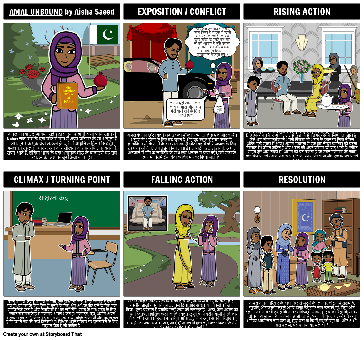 छात्र 6 सेल स्टोरीबोर्ड में कहानी के कथानक को संक्षेप और चित्रण कर सकते हैं, जिसमें प्रदर्शनी और संघर्ष, बढ़ती कार्रवाई, चरमोत्कर्ष / मोड़, गिरती कार्रवाई और संकल्प पर प्रकाश डाला गया है।