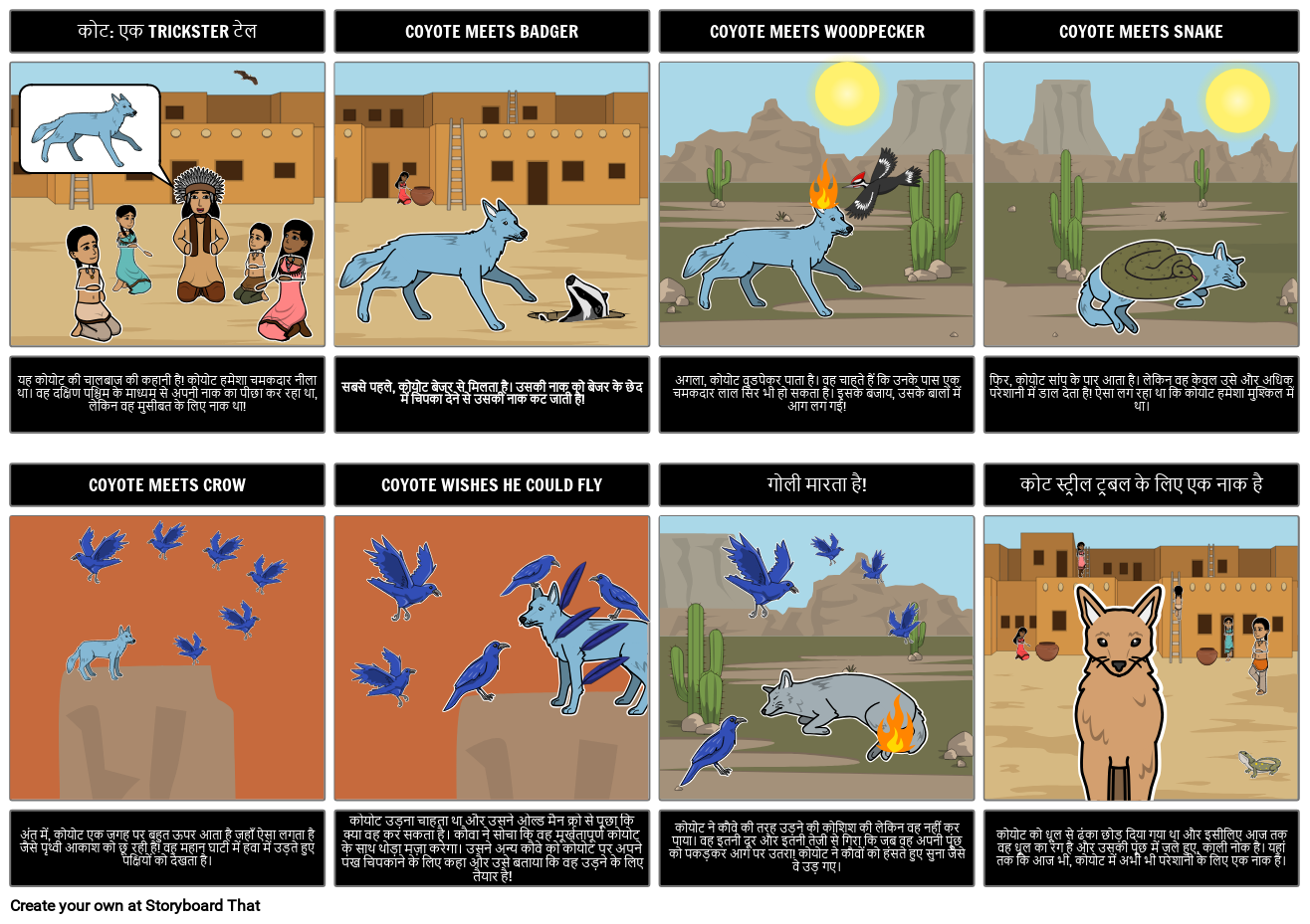 कोयोट ने कौवे की तरह उड़ने की कोशिश की लेकिन वह नहीं कर पाया। वह इतनी दूर और इतनी तेजी से गिरा कि जब वह अपनी पूंछ को पकड़कर आग पर उतरा! कोयोट ने कौवों को हंसते हुए सुना जैसे वे उड़ गए।