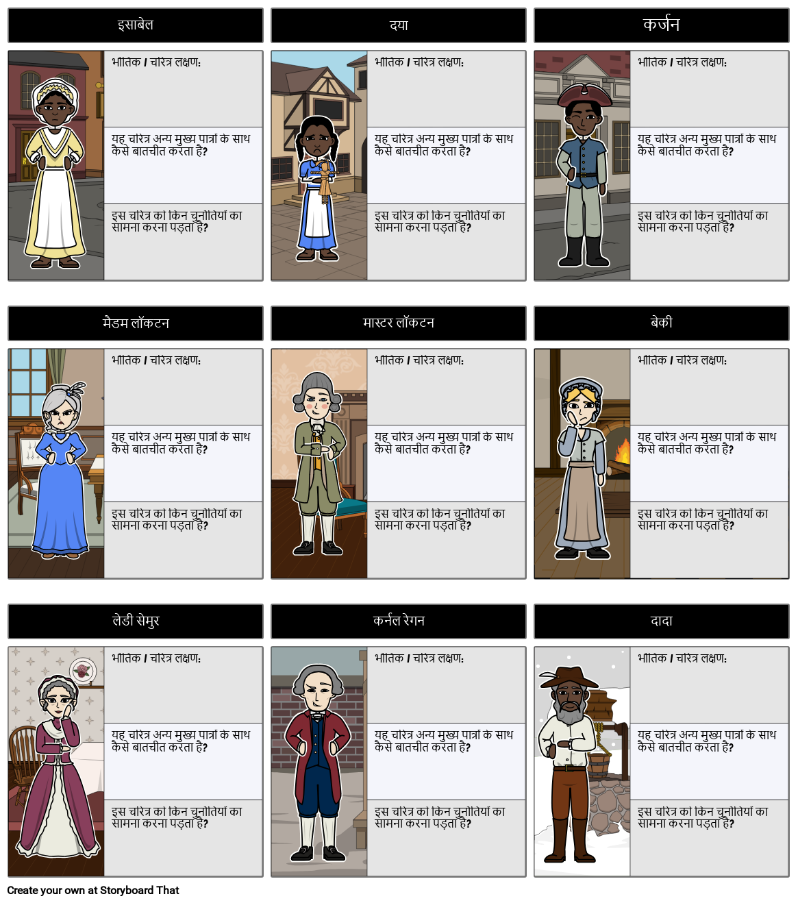 लॉरी हैलस एंडरसन द्वारा चेन भारी बाधाओं के सामने साहस की एक सम्मोहक कहानी है। यह इसाबेल, एक युवा गुलाम लड़की के जीवन का अनुसरण करता है, क्योंकि वह अमेरिकी क्रांति की पूर्व संध्या पर न्यूयॉर्क शहर में रहती है। यहाँ कहानी में मुख्य पात्रों का एक चार्ट है। छात्र इस चार्ट का उपयोग वर्ण लक्षण, बातचीत और चुनौतियों का विश्लेषण करने के लिए कर सकते हैं।