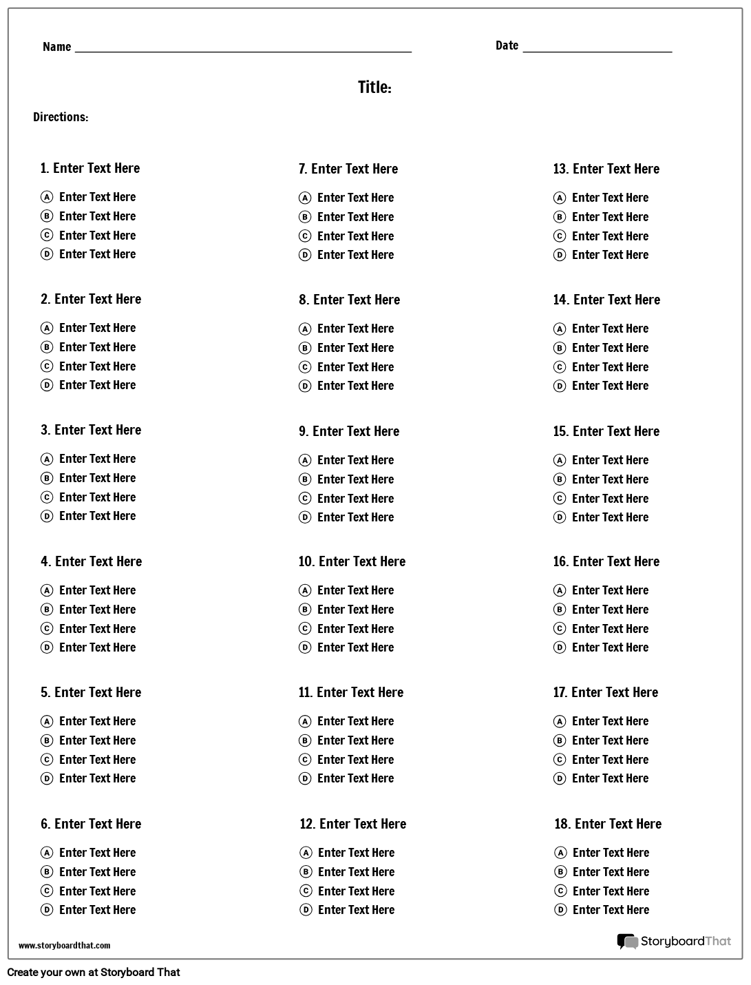 3 कॉलम और 18 प्रश्नों के साथ बहुविकल्पीय प्रश्नोत्तरी टेम्पलेट