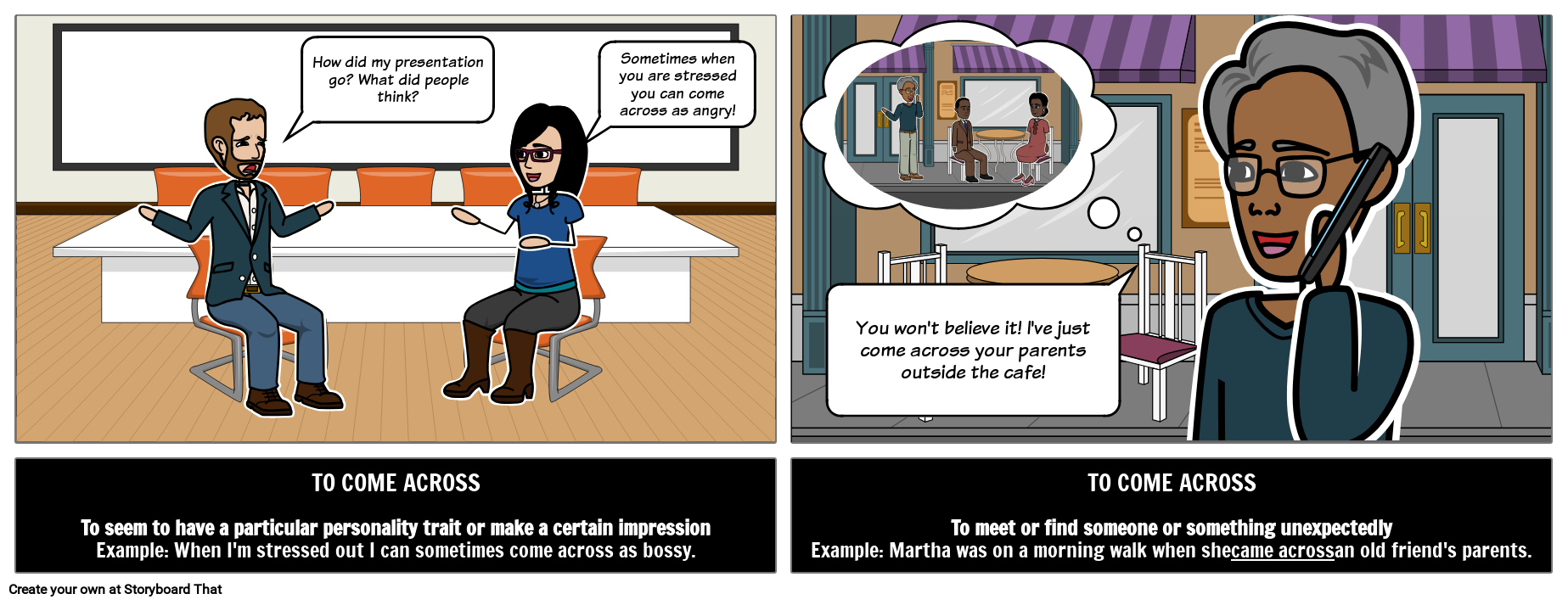 TO COME ACROSSTo seem to have a particular personality trait or make a certain impressionExample: When I'm stressed out I can sometimes come across as bossy.