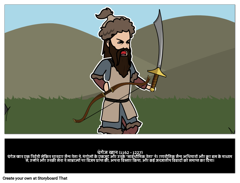 चंगेज खान (1162 - 1227)चंगेज खान एक निर्दयी लेकिन शानदार सैन्य नेता थे, मंगोलों के एकजुट और उनके "सार्वभौमिक नेता" थे। रणनीतिक सैन्य अभियानों और क्रूर बल के माध्यम से, उन्होंने और उनकी सेना ने साम्राज्यों पर विजय प्राप्त की, अपना विस्तार किया, और कई जनजातीय विवादों को समाप्त कर दिया।