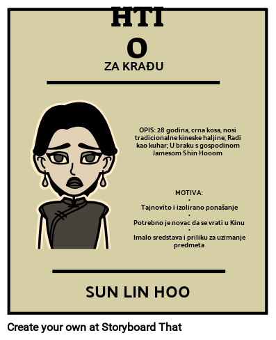 OPIS: 28 godina, crna kosa, nosi tradicionalne kineske haljine; Radi kao kuhar; U braku s gospodinom Jamesom Shin Hooom