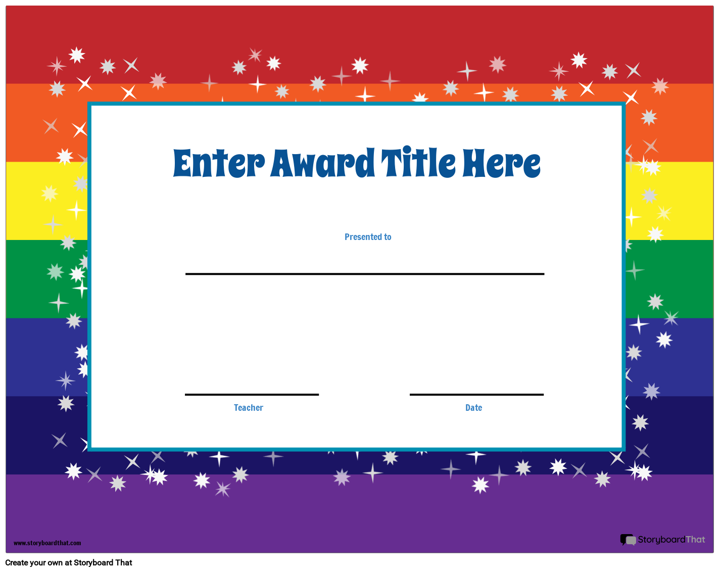 Vaivorykštės tematikos, klasės apdovanojimų šablonas, kurį galima spausdinti ir redaguoti. Naudokite bet kuriam studentui ir bet kokiai temai!