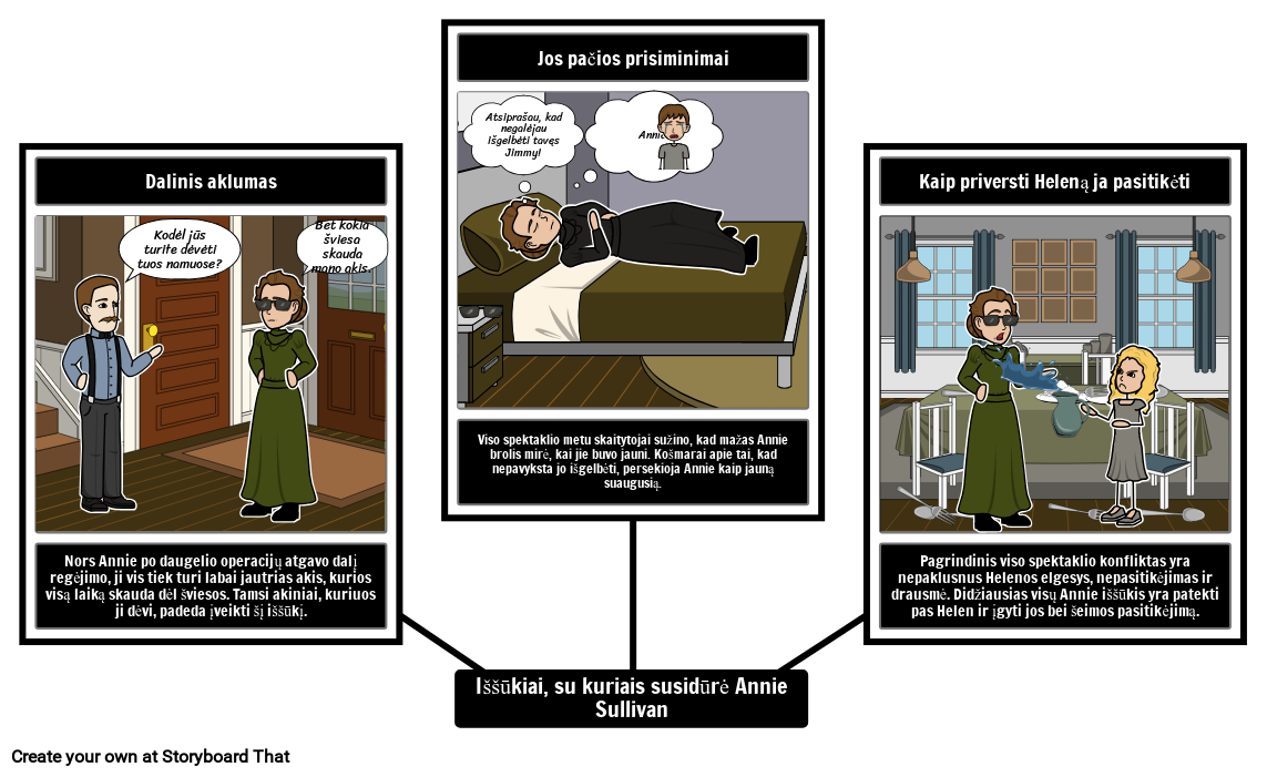 Pagrindinis viso spektaklio konfliktas yra nepaklusnus Helenos elgesys, nepasitikėjimas ir drausmė. Didžiausias visų Annie iššūkis yra patekti pas Helen ir įgyti jos bei šeimos pasitikėjimą.