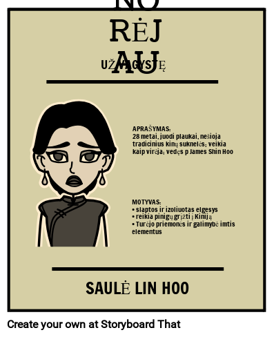 APRAŠYMAS:28 metai, juodi plaukai, nešioja tradicinius kinų suknelės; veikia kaip virėja; vedęs p James Shin Hoo