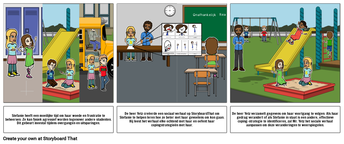 De heer Yetz creëerde een sociaal verhaal op StoryboardThat om Stefanie te helpen leren hoe ze beter met haar gevoelens om kon gaan. Hij leest het verhaal elke ochtend met haar en oefent haar copingstrategieën met haar.