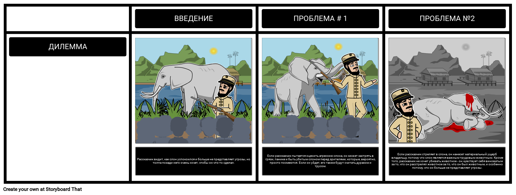 Рассказчик видит, как слон успокоился и больше не представляет угрозы, но толпа позади него очень хочет, чтобы он что-то сделал.