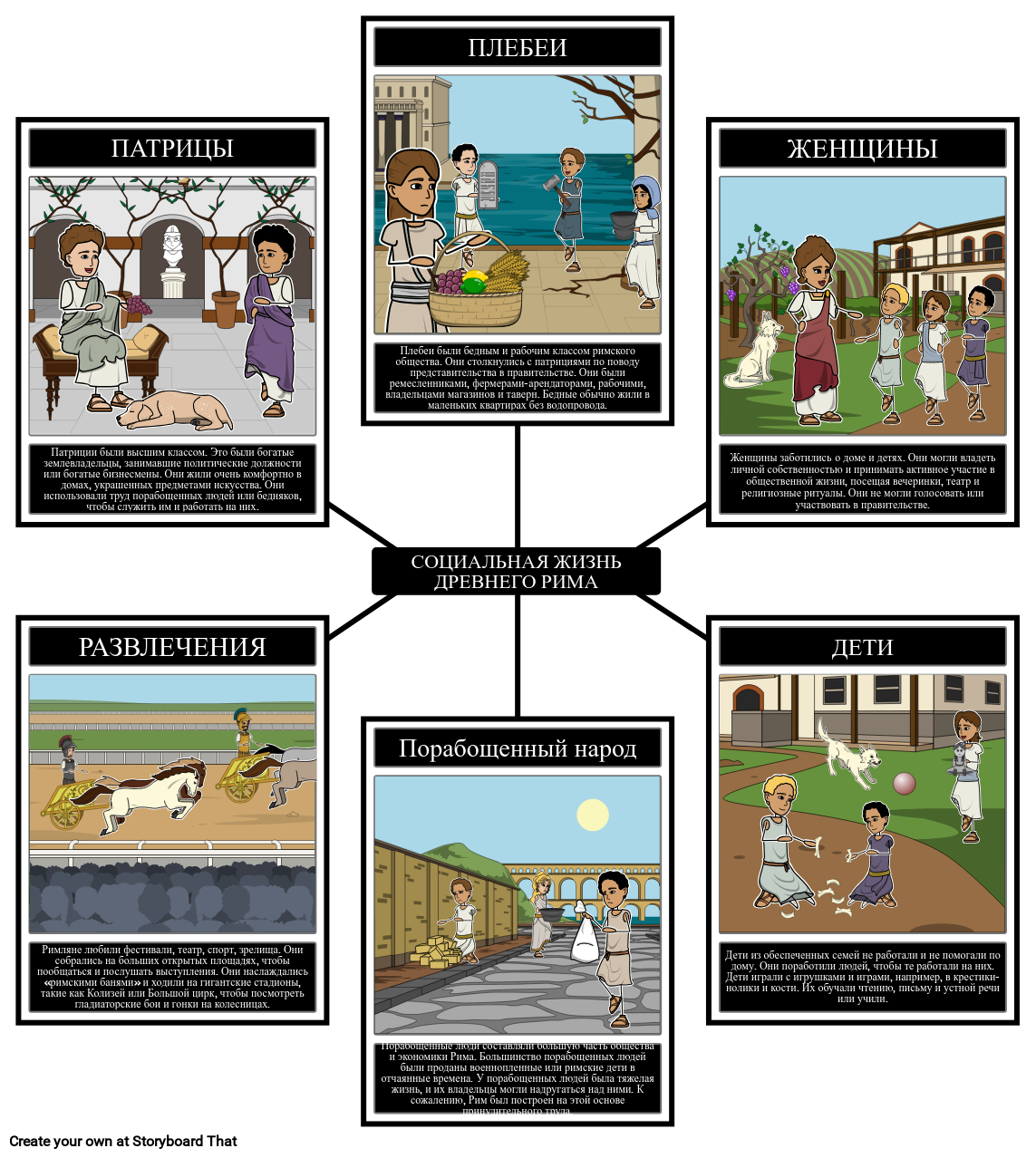 Порабощенные люди составляли большую часть общества и экономики Рима. Большинство порабощенных людей были проданы военнопленные или римские дети в отчаянные времена. У порабощенных людей была тяжелая жизнь, и их владельцы могли надругаться над ними. К сожалению, Рим был построен на этой основе принудительного труда.