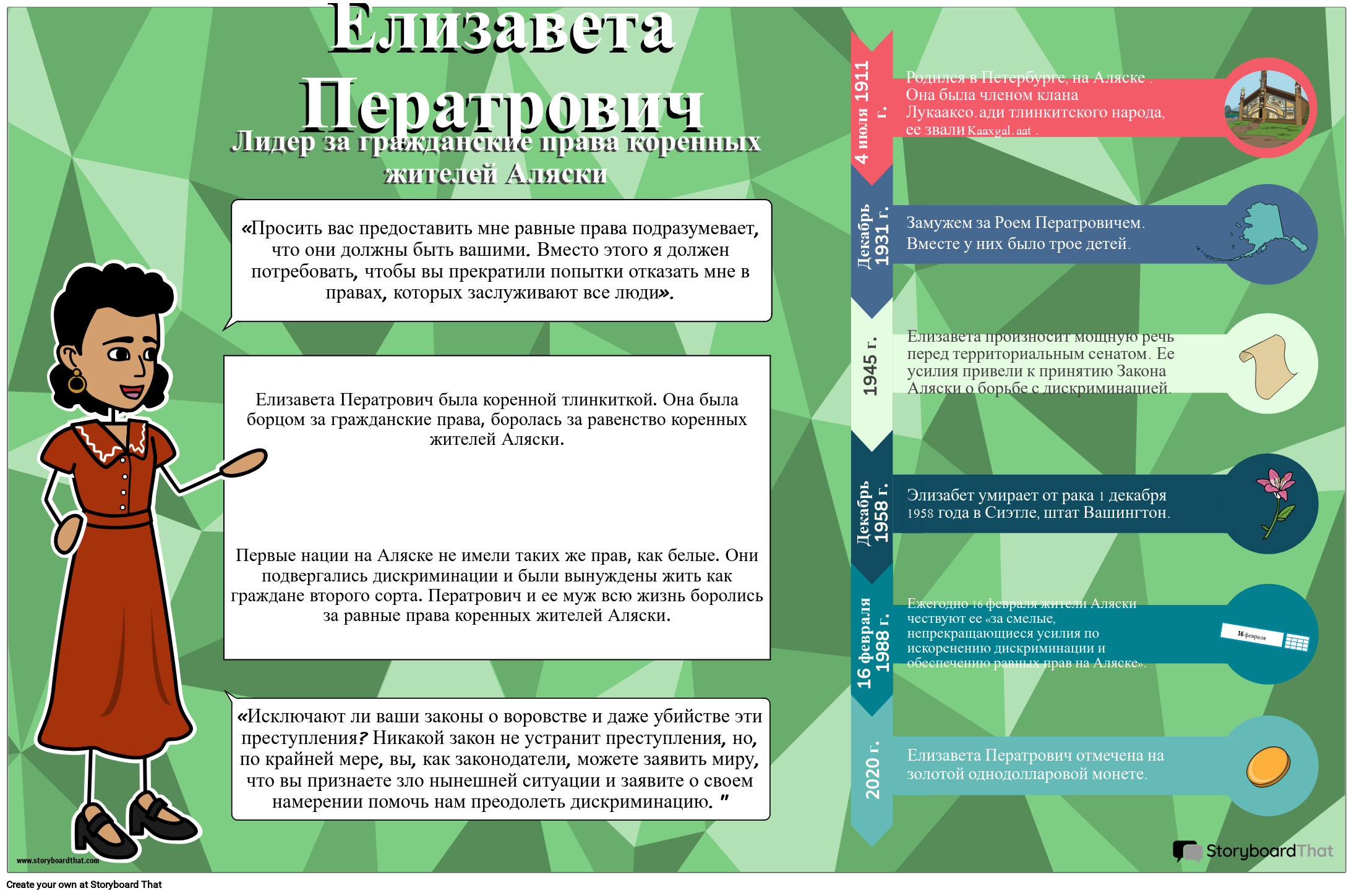 Елизавета Ператрович была коренной тлинкиткой. Она была борцом за гражданские права, боролась за равенство коренных жителей Аляски. Первые нации на Аляске не имели таких же прав, как белые. Они подвергались дискриминации и были вынуждены жить как граждане второго сорта. Ператрович и ее муж всю жизнь боролись за равные права коренных жителей Аляски.