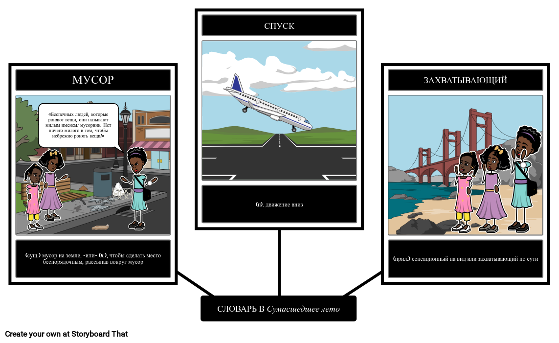 Создайте раскадровку, которая иллюстрирует и определяет новый словарный запас из книги One Crazy Summer.