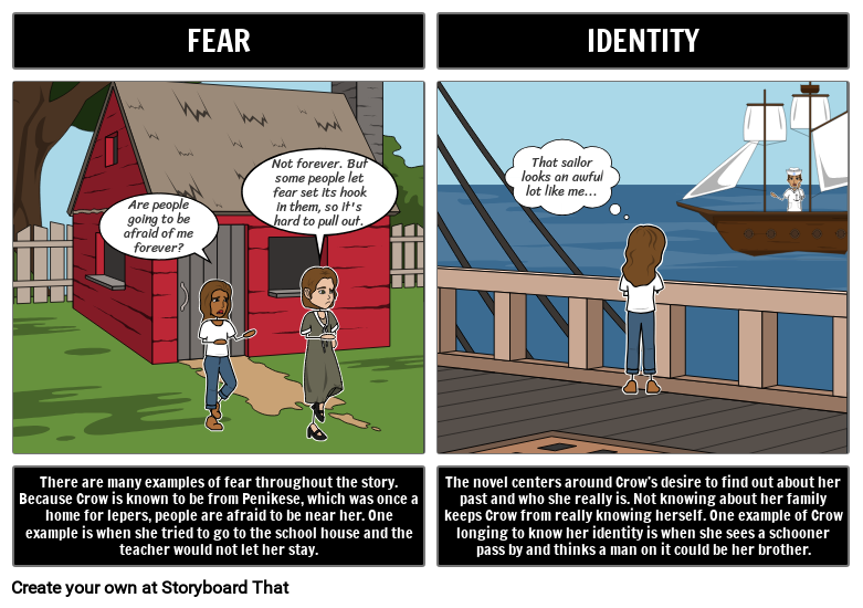 There are many examples of fear throughout the story. Because Crow is known to be from Penikese, which was once a home for lepers, people are afraid to be near her. One example is when she tried to go to the school house and the teacher would not let her stay.