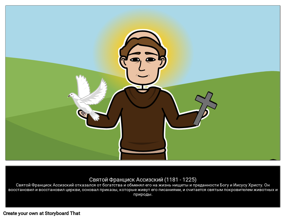 Святой Франциск Ассизский | Святой Франциск Ассизский отказался от богатства и обменял его на жизнь нищеты и преданности Богу и Иисусу Христу. Он восстановил и восстановил церкви, основал приказы, которые живут его писаниями, и считается святым покровителем животных и природы.