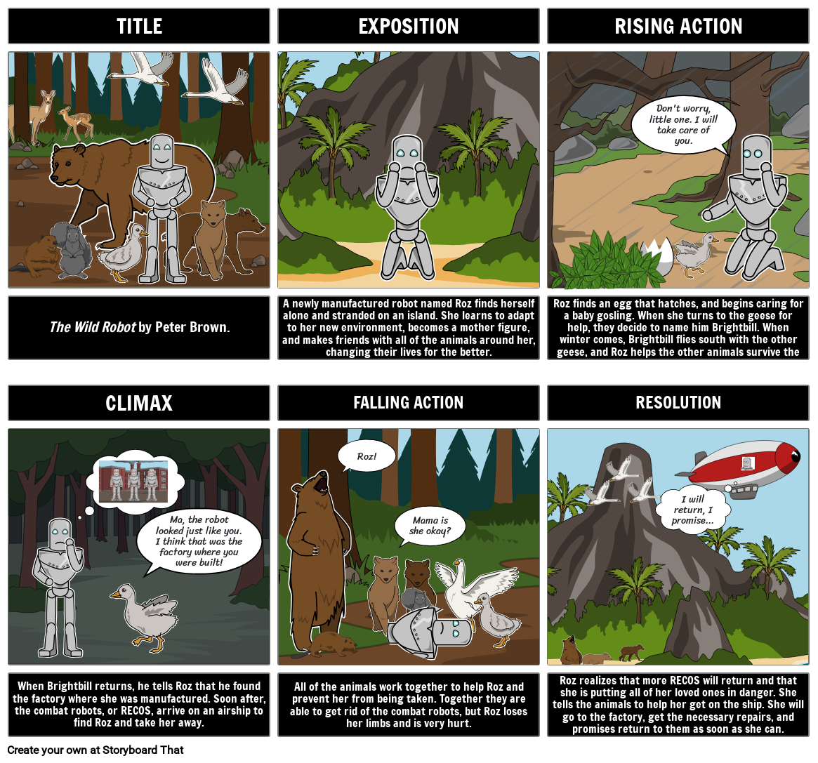 All of the animals work together to help Roz and prevent her from being taken. Together they are able to get rid of the combat robots, but Roz loses her limbs and is very hurt.