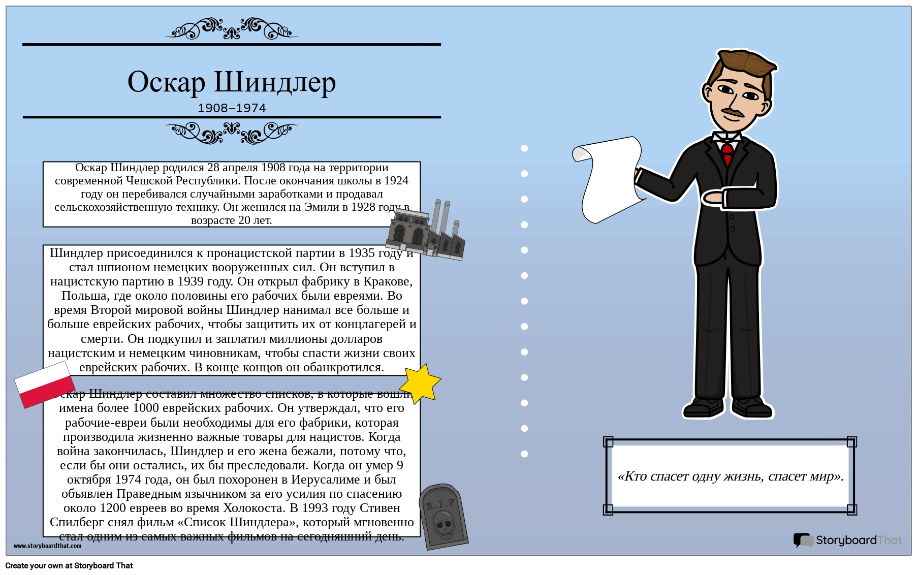 Студенты могут создать биографию Оскара Шиндлера или других влиятельных фигур во время Холокоста.