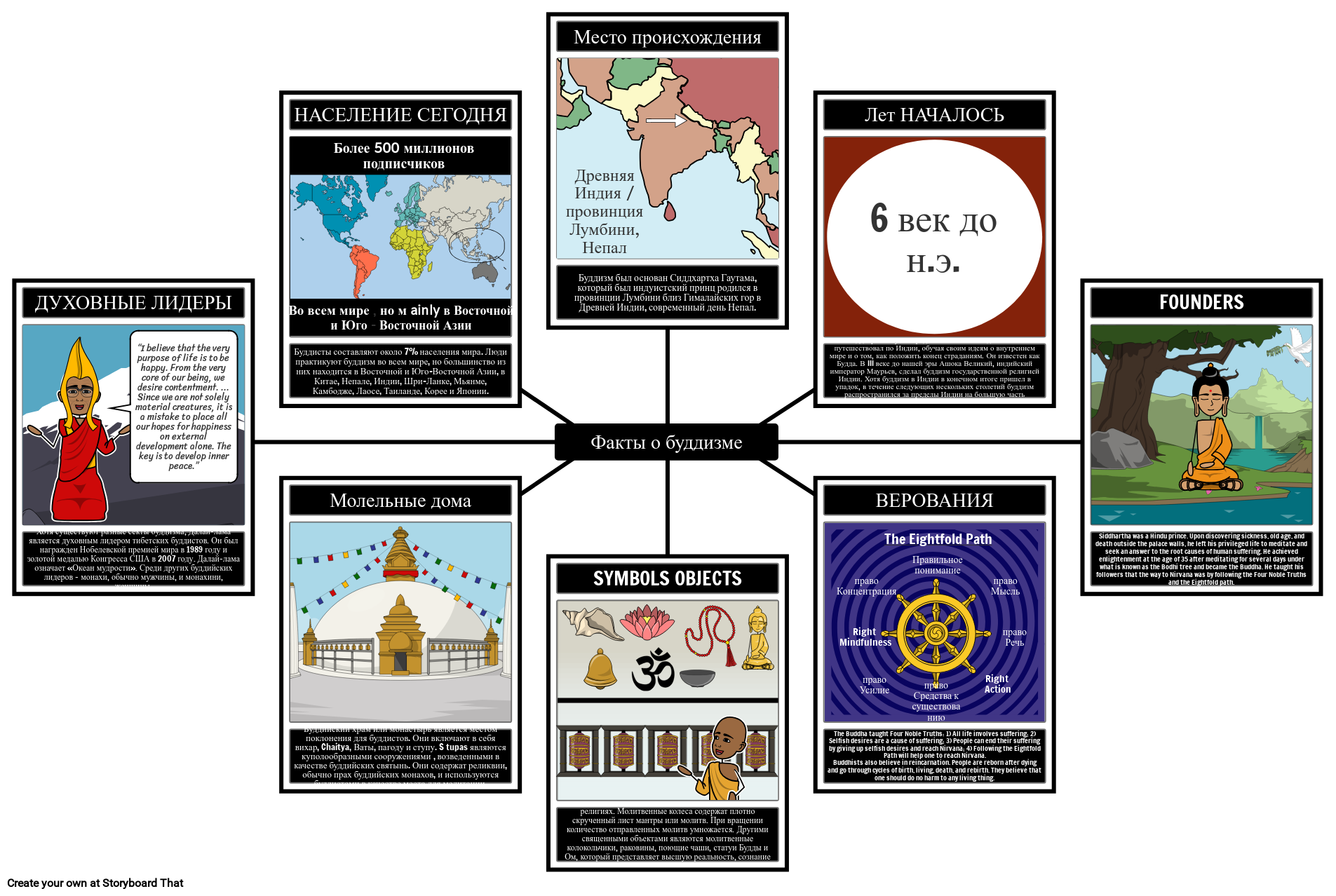 Попросите учащихся описать и проиллюстрировать различные факты о буддизме. Они могут ответить на следующие вопросы: Откуда возникла религия? Кто были ее основателями? Когда она возникла ?; Каковы некоторые из основных убеждений ?; Каковы некоторые примеры священных предметов или символов ?: Как поклоняются его последователи / молитвенные дома; Кто его духовные лидеры? И т. Д.