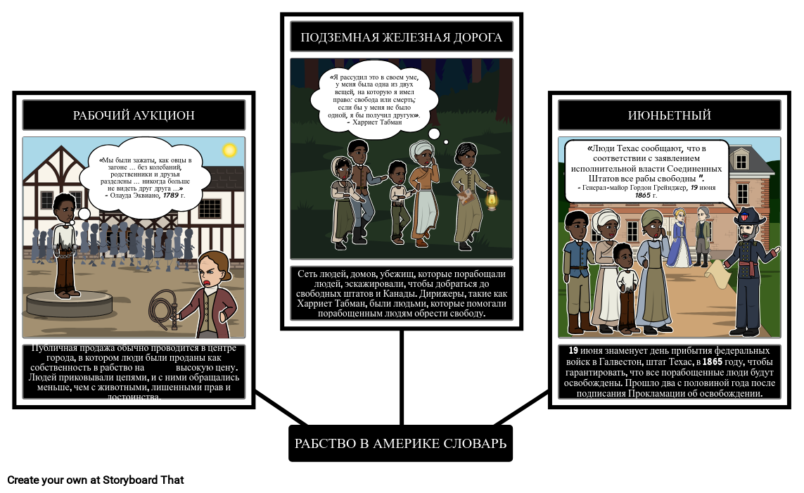 Создайте раскадровку, иллюстрирующую словарный запас, относящийся к рабству в Америке.