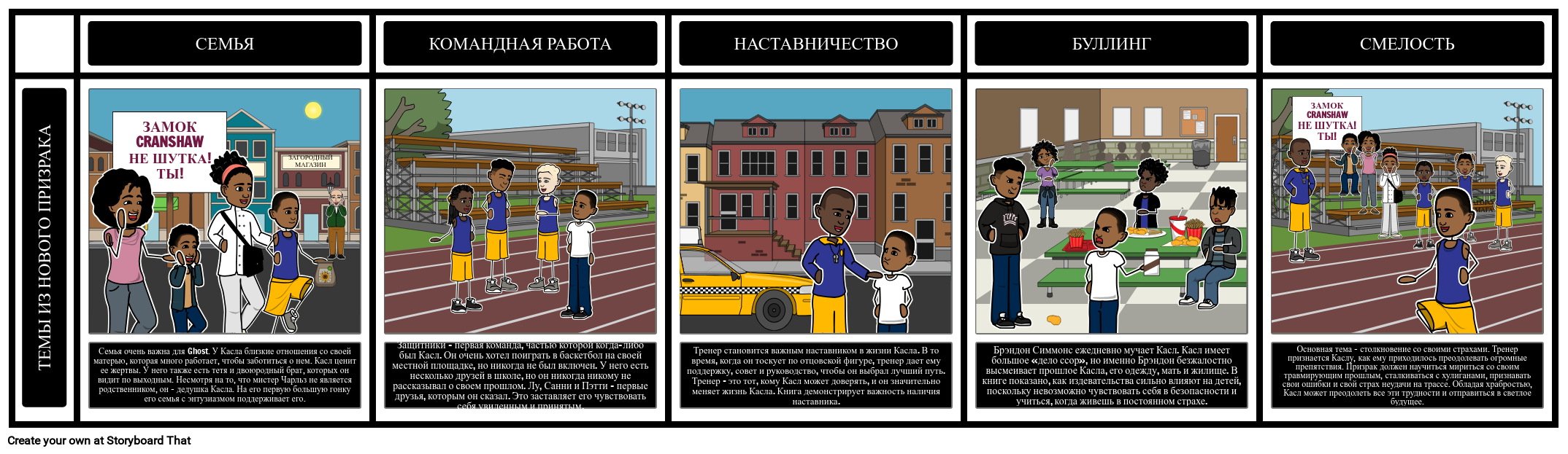 В романе «Призрак» присутствует множество тем: семья, работа в команде, наставничество, издевательства, мужество, идентичность, память и прошлое, посттравматическое стрессовое расстройство, нарушение закона и справедливость, домашнее насилие, бедность. Учащиеся могут изучить тему романа, определив тему или получив тему для отслеживания во время чтения. Затем учащиеся могут создать раскадровку, иллюстрирующую примеры этой темы из текста.