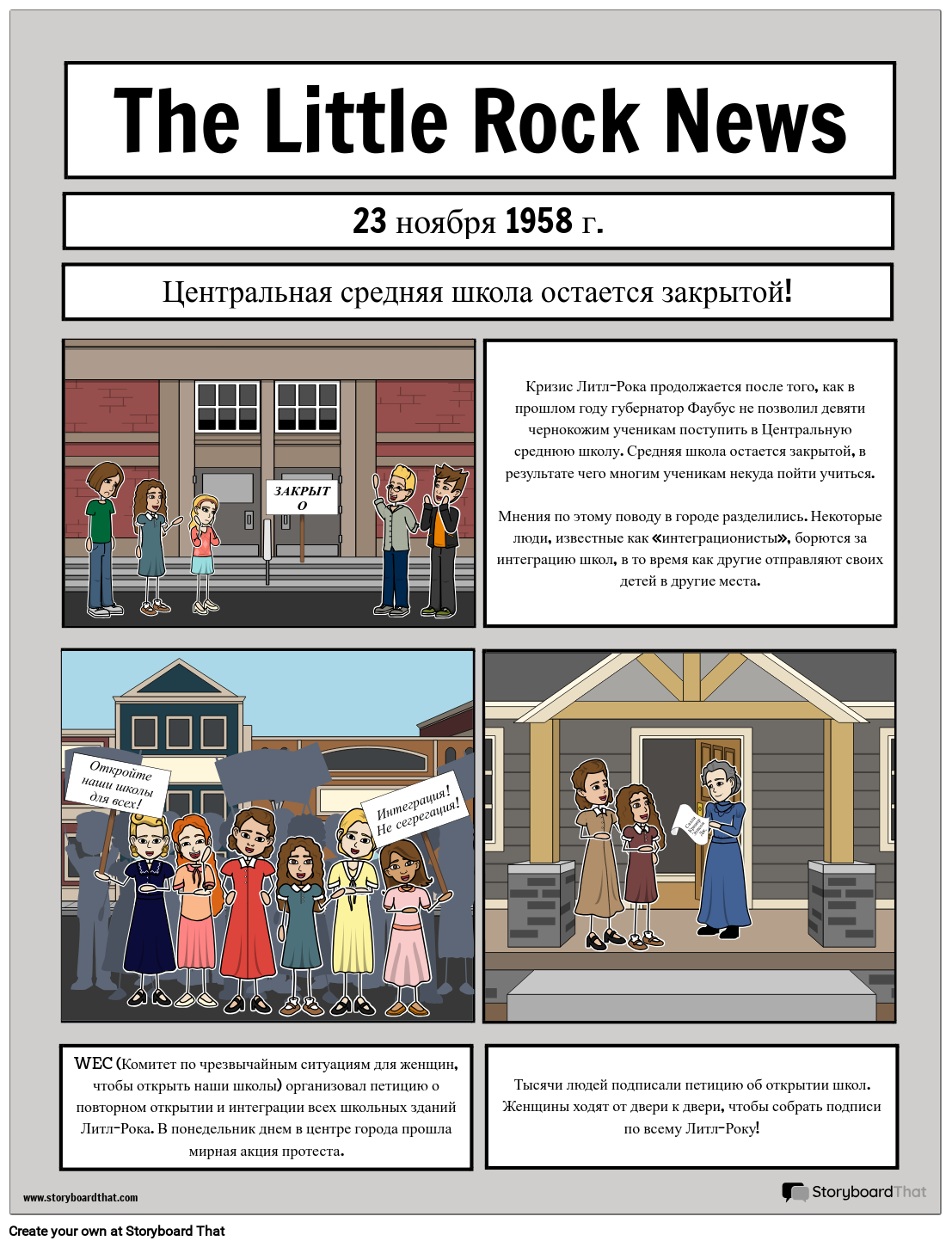 Кризис Литл-Рока продолжается после того, как в прошлом году губернатор Фаубус не позволил девяти чернокожим ученикам поступить в Центральную среднюю школу. Средняя школа остается закрытой, в результате чего многим ученикам некуда пойти учиться. Мнения по этому поводу в городе разделились. Некоторые люди, известные как «интеграционисты», борются за интеграцию школ, в то время как другие отправляют своих детей в другие места.