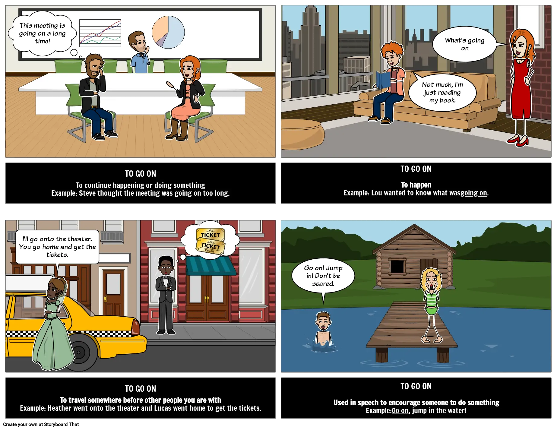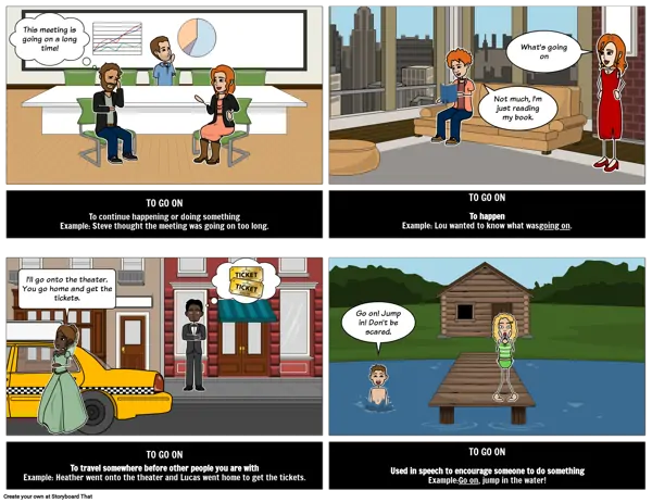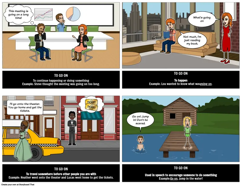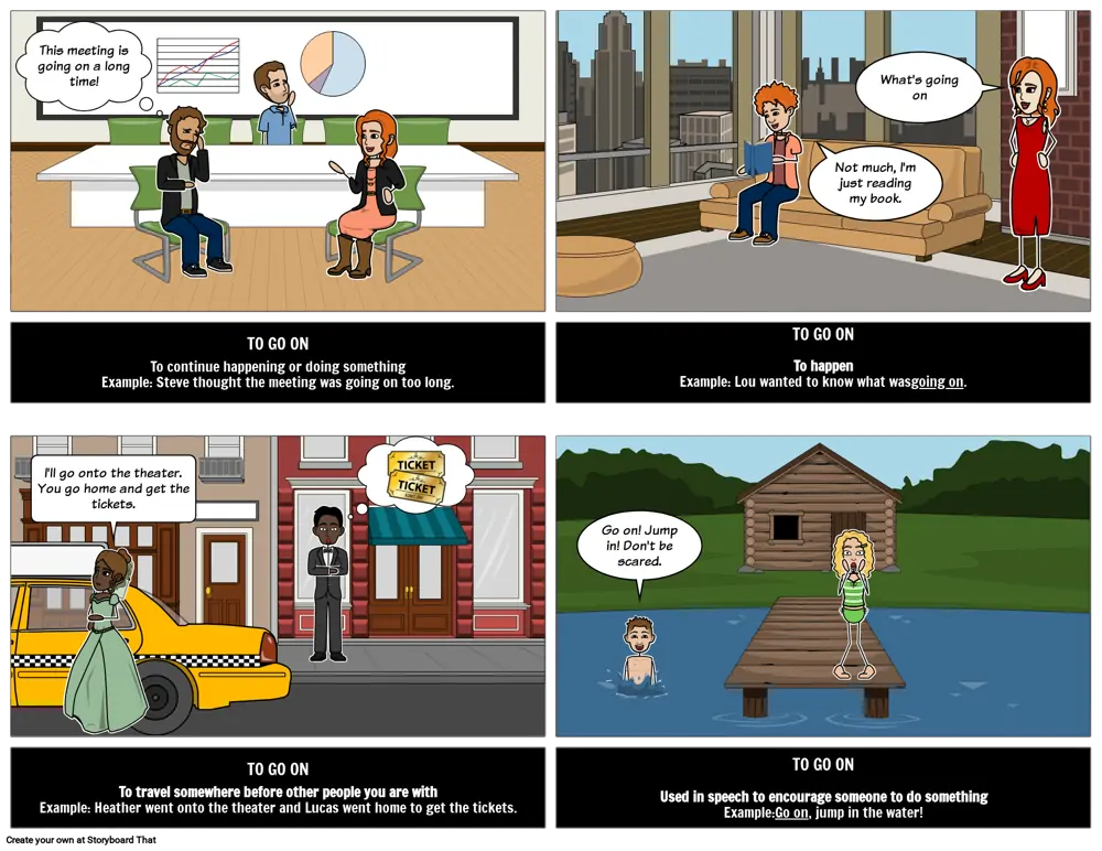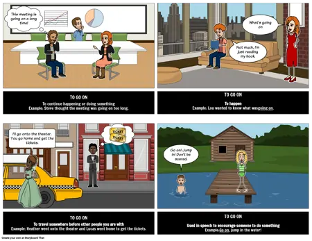 TO GO ONTo continue happening or doing somethingExample: Steve thought the meeting was going on too long.