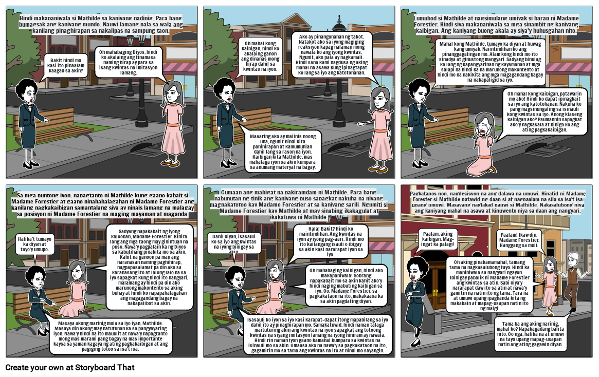 Mahal kong Mathilde, tumayo ka diyan at huwag kang umiyak. Naiintindihan ko ang pinanggagalingan mo. Alam kong hindi mo ito sinadya at ginustong mangyari. Sadyang binulag ka lang ng kapangyarihan ng kayamanan at mga salapi na hindi ka na marunong makontento at hindi mo na nakikita ang mga magagandang bagay na nakapaligid sa iyo.